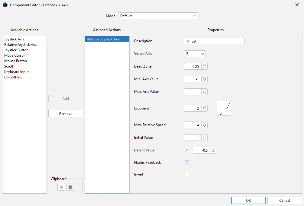 Haptic feedback is a special feature that can be enabled for relative axis mappings. It causes the controller to vibrate slightly when either end of a relative axis, or a user defined axis position (dentent), is reached.