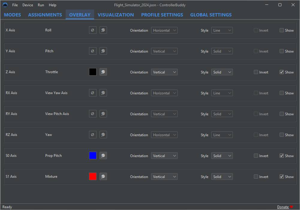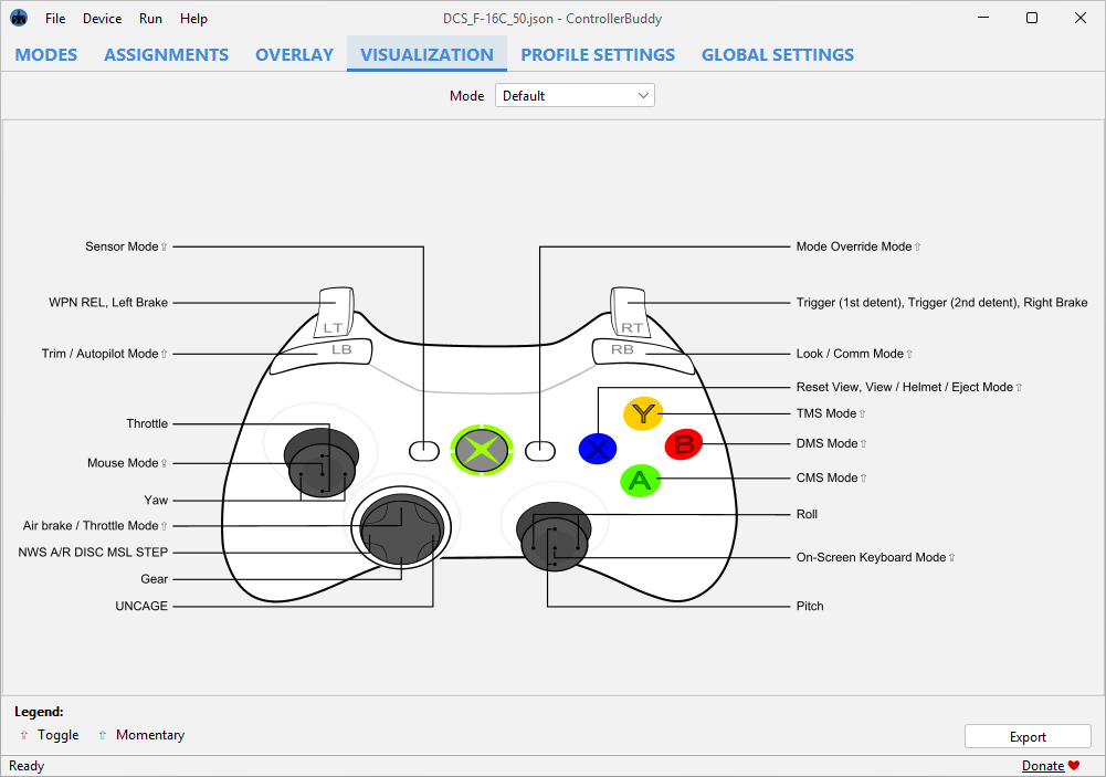 Since the required inputs vary greatly from simulator to simulator and even from aircraft to aircraft, a custom tailored profile for each simulator, and in case of complex titles such as DCS for each aircraft, is necessary. These profiles can be edited within ControllerBuddy and be permanently stored as files on your computer.